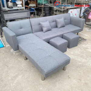 Mô tả: Băng sofa góc L cũ thiết kế hiện đại, màu xám trung tính dễ phối hợp với nhiều không gian nội thất. Đệm bọc vải bố thoáng khí, tạo cảm giác êm ái khi sử dụng. Khung gỗ chắc chắn, chân inox cao cấp giúp chịu lực tốt, tăng độ bền. Bộ sofa kèm theo đôn ghế nhỏ và gối tựa giúp tăng thêm sự tiện lợi và thoải mái. Phù hợp sử dụng cho phòng khách, văn phòng hoặc quán cafe.