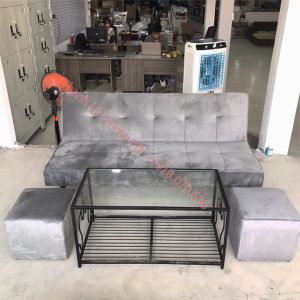 Mô tả: Bộ sofa màu xám 2 chức năng có thể ngã ra thành giường ngủ tiện lợi. Sản phẩm có nệm bọc vải nhung xám rất mịn đẹp, êm ái thoải mái khi sử dụng.