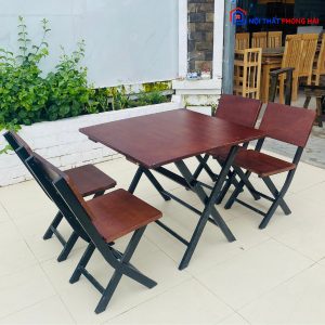 Mô tả: Bộ bàn ghế quán ăn với thiết kế đơn giản và cổ điển, chân bàn chắc chắn từ chất liệu sắt cao cấp, được sơn tĩnh điện để tránh trầy xước và bong tróc. Mặt bàn dày và chắc chắn, đặc biệt có khả năng gập gọn tiện lợi khi không sử dụng, giúp tiết kiệm không gian. Màu sắc trầm ấm và hài hòa tạo nên sự tinh tế, phù hợp với nhiều loại không gian nội thất. Sở hữu ngay để tạo điểm nhấn độc đáo cho quán ăn của bạn.