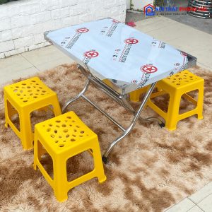Mô tả: Bộ bàn ăn với phong cách bình dân, dân giã và đơn giản. Ghế nhựa cao cấp, kết hợp với bàn inox cứng cáp có thể gấp gọn, tạo lên sự hài hòa và tinh tế hoàn hảo cho quán ăn, quán nhậu, và quán nước vỉa hè của bạn. Bộ bàn ghế cực kỳ dễ dàng vệ sinh và dọn dẹp và di chuyển, ghế có thể xếp chồng lên nhau dễ dàng để tiết kiệm diện tích khi không sử dụng.