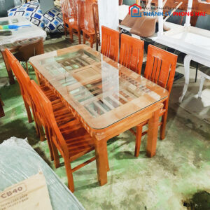 Mô tả: Bộ bàn ăn gỗ gồm 1 bàn và 6 ghế, thích hợp sử dụng cho gia đình hoặc nhà hàng, quán ăn. Bàn ăn được làm từ gỗ tự nhiên, mặt bàn có kính cường lực bảo vệ, giúp tạo thêm vẻ sang trọng và thuận tiện cho việc vệ sinh. Ghế được thiết kế tựa lưng cao, mang lại sự thoải mái khi ngồi dùng bữa. Chất liệu gỗ tự nhiên bền bỉ, màu sắc ấm áp, thích hợp với nhiều không gian nội thất. Bộ bàn ghế này mang lại vẻ đẹp truyền thống và tiện lợi cho các bữa ăn gia đình, đảm bảo độ bền và chất lượng tốt.