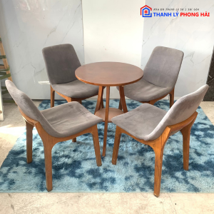 Mô tả: Bộ bàn ghế cafe với kiểu dáng sang trọng và thời thượng, gồm 1 bàn tròn và 4 ghế. Bàn được làm từ chất liệu gỗ cứng cáp và chắc chắn, ghế bọc vải nhung mang lại cảm giác ngồi êm ái và thoải mái. Tuy đã qua sử dụng nhưng tổng quan bộ bàn ghế còn rất đẹp và mới, không bị hư hại hay hỏng hóc, sẵn sàng sử dụng ngay.