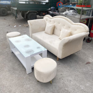 Mô tả: Bộ sofa màu kem này mang kiểu dáng cổ điển với phần tựa lưng được thiết kế uốn lượn, đính thêm các nút bọc tạo điểm nhấn tinh tế. Ghế đi kèm với hai đôn tròn nhỏ, giúp tối ưu hóa không gian và tạo sự tiện lợi khi sử dụng. Chất liệu vải nhung mềm mịn kết hợp với chân ghế kim loại mang lại vẻ đẹp sang trọng và hiện đại cho không gian phòng khách.