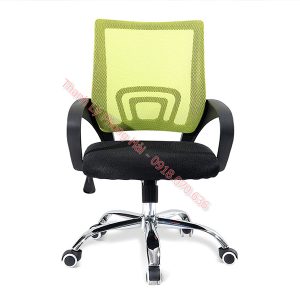 Mô tả: ghế văn phòng phần lưng bọc lưới xanh thoáng mát và đệm mút được bọc phù hợp với thời tiết nóng ẩm tại Việt Nam. Chân xoay được làm từ chất liệu mạ crom, có thể di chuyển và xoay 360 độ. Tay ghế vịn cố định làm từ nhựa PP tổng hợp