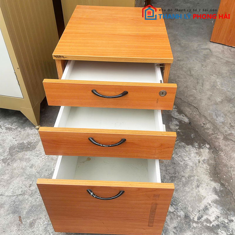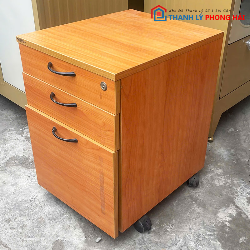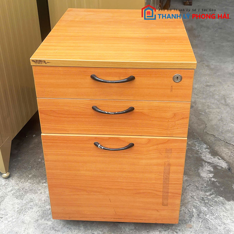 Tủ làm từ gỗ công nghiệp phủ vân gỗ, bề mặt phẳng, dễ vệ sinh. Thiết kế 3 ngăn kéo tiện lợi để hồ sơ, giấy tờ, vật dụng cá nhân; ray kéo còn trơn, thao tác nhẹ. Tủ có bánh xe di chuyển linh hoạt. Có lựa chọn tủ có khóa để cất giữ tài liệu quan trọng hoặc không khóa cho nhu cầu dùng thường ngày. Hàng đã qua sử dụng nhưng kết cấu còn chắc, dùng ổn định.