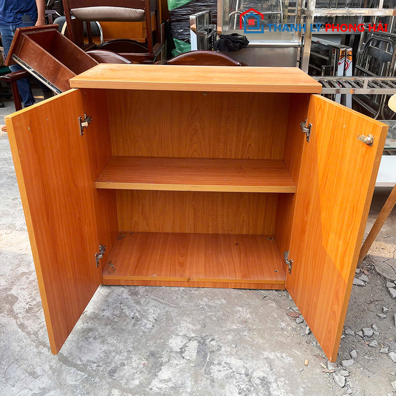 Tủ làm từ gỗ công nghiệp phủ vân gỗ, bề mặt phẳng, dễ lau chùi. Bên trong có đợt chia tầng, thuận tiện để hồ sơ, tài liệu, sổ sách hoặc vật dụng văn phòng. Cửa tủ mở nhẹ, tay nắm chắc chắn, có khóa, đảm bảo an toàn khi cất giữ giấy tờ quan trọng. Hàng đã qua sử dụng nhưng kết cấu còn ổn, dùng tốt.