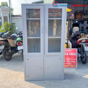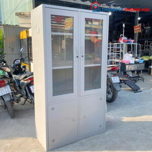 Mô tả: Tủ hồ sơ sắt cũ màu ghi xám, gồm hai ngăn kính phía trên để tài liệu cần nhìn rõ, phần dưới cánh sắt kín để hồ sơ bảo mật. Khung sắt dày, hạn chế móp méo khi va chạm. Bề mặt sơn tĩnh điện chống gỉ, dễ vệ sinh. Phù hợp văn phòng, cơ quan muốn lưu trữ hồ sơ lâu dài.