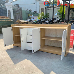 Mô tả: Tủ hồ sơ cũ bề ngang 2m, phân chia nhiều ngăn để sắp xếp tài liệu, hồ sơ gọn gàng. Cánh tủ đóng mở êm, tay nắm dễ cầm, hạn chế kẹt. Mặt trên có thể tận dụng bày thêm đồ dùng. Màu gỗ và trắng kết hợp hài hòa, tạo điểm nhấn hiện đại cho văn phòng hoặc nhà ở.