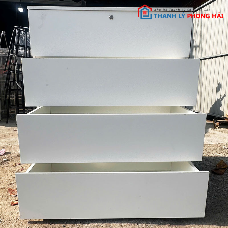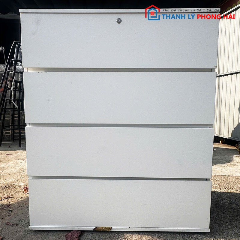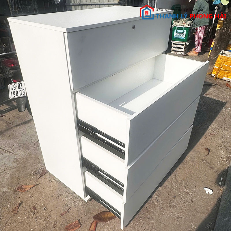 Tủ có các ngăn kéo rộng, thao tác kéo mở nhẹ, dễ sử dụng. Bề mặt tủ phẳng, màu sáng, dễ lau chùi và ít bám bẩn. Kết cấu chắc chắn, để đồ ổn định, không rung lắc khi sử dụng. Sản phẩm đã qua sử dụng nhưng còn tốt, phù hợp cho anh chị cần một chiếc tủ đơn giản, tiết kiệm chi phí.