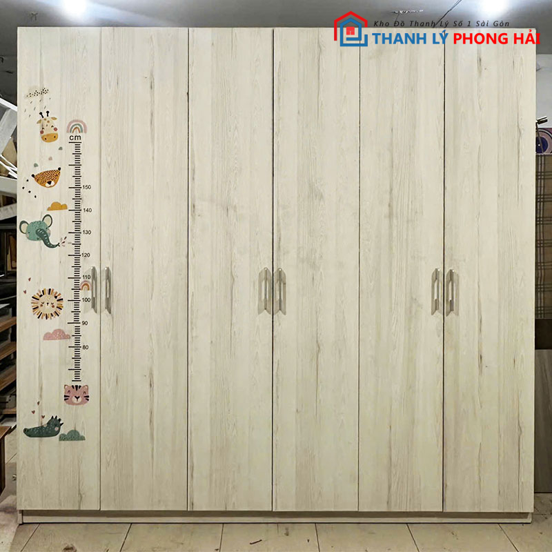 Tủ Quần Áo 6 Cánh Gỗ MDF 2m24 Cũ – Thiết Kế Nhiều Ngăn, Kèm Gương