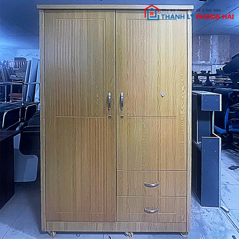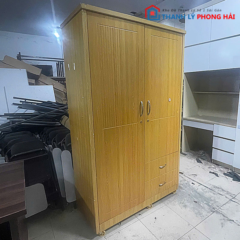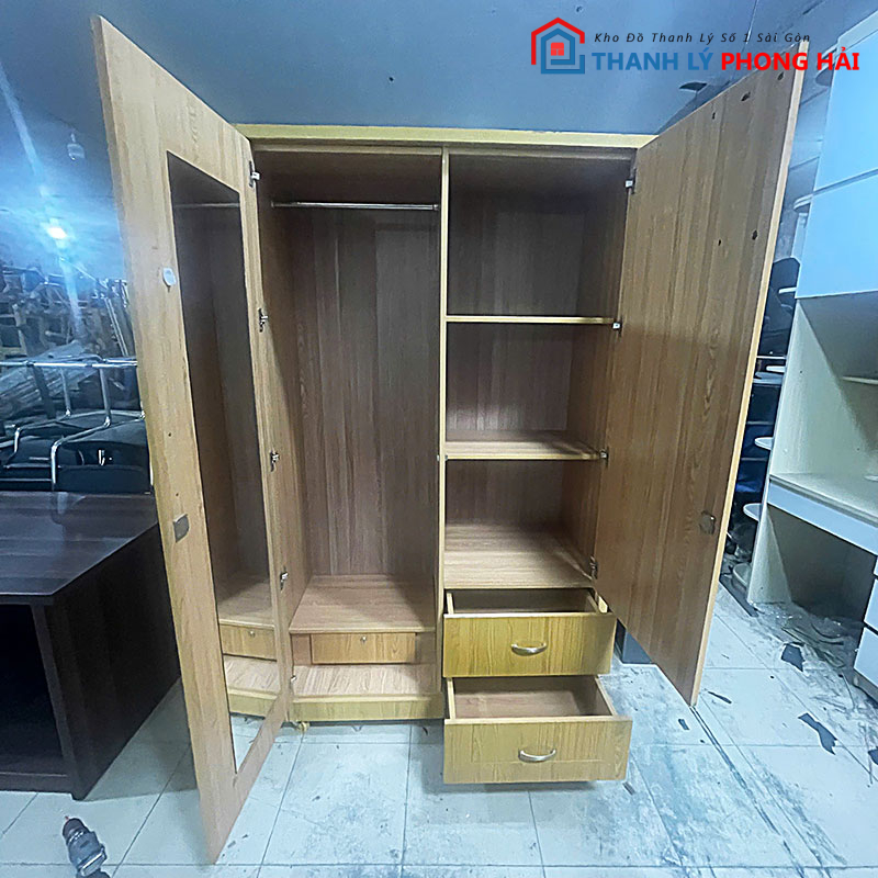 Bên trong tủ chia rõ khu vực treo áo dài, treo áo ngắn kết hợp các ngăn kệ và hộc kéo để đồ gấp, phụ kiện. Cánh mở chắc chắn, bản lề còn tốt, đóng mở êm. Màu vân gỗ sáng, dễ phối với nhiều không gian nội thất khác nhau.