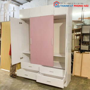 Mô tả: Tủ quần áo cũ thiết kế 4 cánh lớn với tông màu trắng phối hồng nổi bật. Tủ gồm các ngăn kéo dưới cùng giúp dễ dàng sắp xếp quần áo, phụ kiện. Phần trên được chia thành các ô chứa đồ rộng rãi, tiện dụng.