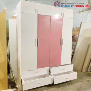 Mô tả: Tủ quần áo cũ thiết kế 4 cánh lớn với tông màu trắng phối hồng nổi bật. Tủ gồm các ngăn kéo dưới cùng giúp dễ dàng sắp xếp quần áo, phụ kiện. Phần trên được chia thành các ô chứa đồ rộng rãi, tiện dụng.