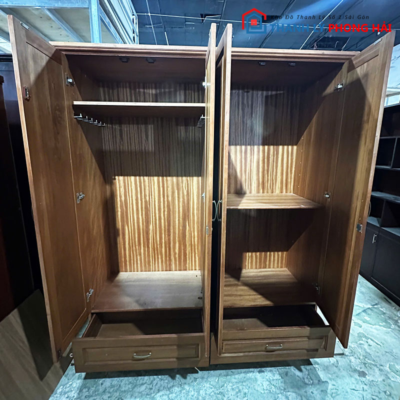 Tủ quần áo gỗ tự nhiên 4 cánh nhiều ngăn hiện có sẵn tại Thanh Lý Phong Hải, hỗ trợ giao hàng tận nơi trong TP.HCM và các tỉnh lân cận. Ngoài mẫu tủ gỗ tự nhiên cũ này, kho còn nhiều loại tủ gỗ tự nhiên, tủ MDF, tủ nhựa và tủ quần áo cánh lùa phù hợp với nhiều nhu cầu khác nhau. Quý khách có thể đến trực tiếp kho để tham khảo và chọn được mẫu tủ phù hợp nhất cho gia đình.