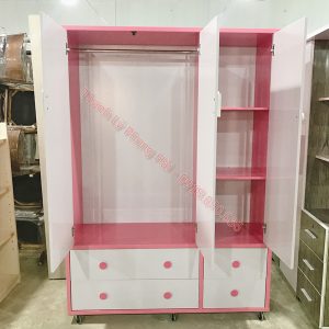 Mô tả: Tủ quần áo nhựa 3 cánh có phần tay cầm hình gấu độc đáo, màu trắng hồng dễ thương. Phía dưới là 6 hộc tủ rộng rãi, có thiết kế thanh treo đồ tiện dụng. Phù hợp với những cô gái yêu thích sự mộng mơ, ngọt ngào.