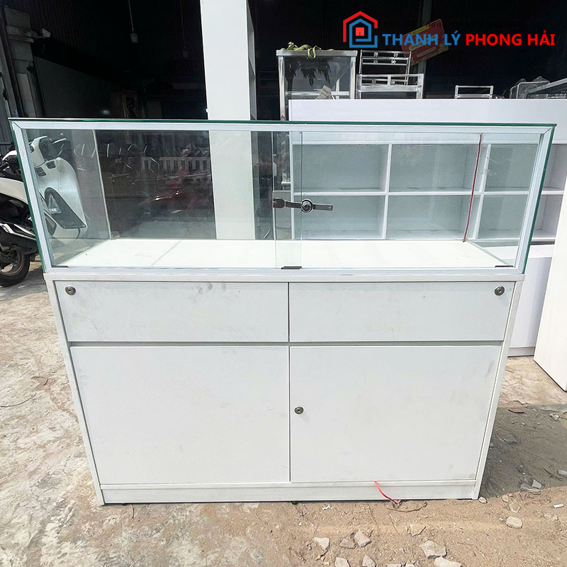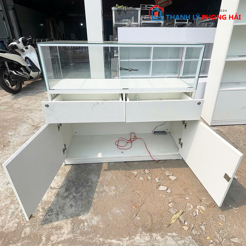 Tủ làm từ gỗ công nghiệp màu trắng, kiểu dáng đơn giản, dễ phối với nhiều không gian khác nhau. Phần dưới có khoang tủ kín để chứa hàng hóa, vật dụng dự trữ hoặc đồ cá nhân, giúp khu vực trưng bày luôn gọn gàng. Cánh mở thuận tiện, kết cấu chắc chắn, hàng đã qua sử dụng nhưng vẫn sử dụng tốt.
