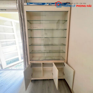 Tình trạng: Tủ sạch sẽ, kính không trầy vỡ, cửa đóng mở mượt, bánh xe còn chạy tốt.