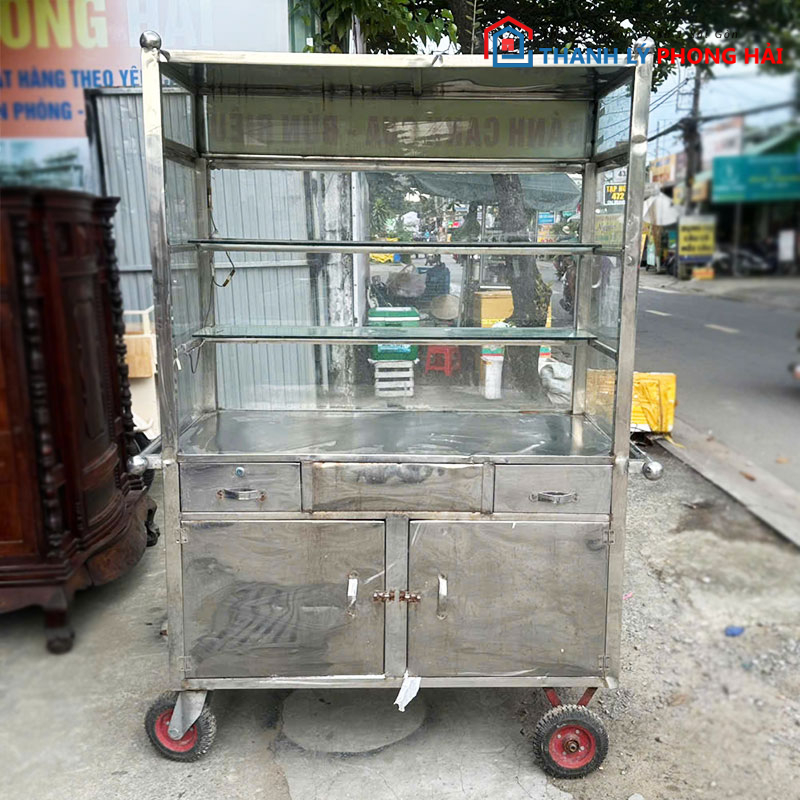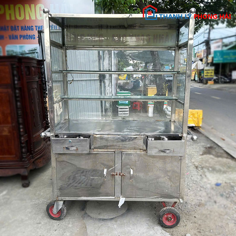 Mẫu xe bán hàng inox 1m16 cũ phù hợp cho các quán ăn, tiệm bún, bánh canh, hủ tiếu, đồ ăn nhanh hoặc cà phê mang đi. Thiết kế khung chắc chắn, kính trong suốt dễ quan sát thực phẩm, kèm mái che và ngăn chứa đồ tiện lợi. Bên dưới có bánh xe giúp di chuyển linh hoạt, thích hợp sử dụng trong nhà hoặc ngoài trời.