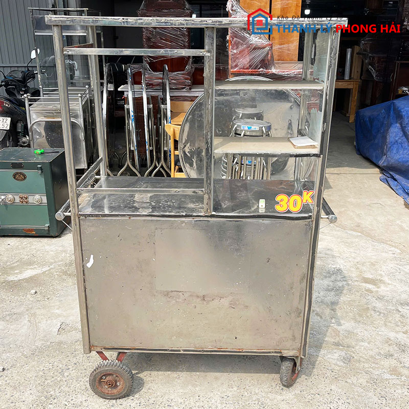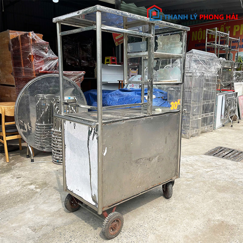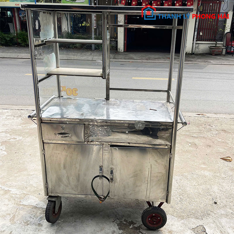 Xe được làm từ inox sáng, dễ lau chùi, hạn chế bám bẩn, phù hợp với nhu cầu bán thực phẩm. Phần trên có khung kính và kệ trưng bày giúp khách dễ quan sát sản phẩm, phía dưới là khoang chứa đồ rộng rãi để nguyên liệu, dụng cụ bán hàng. Xe có bánh xe chắc chắn, đẩy đi nhẹ, thuận tiện di chuyển mỗi ngày. Hàng đã qua sử dụng nhưng còn dùng tốt, phù hợp cho anh chị cần tiết kiệm chi phí đầu tư ban đầu.